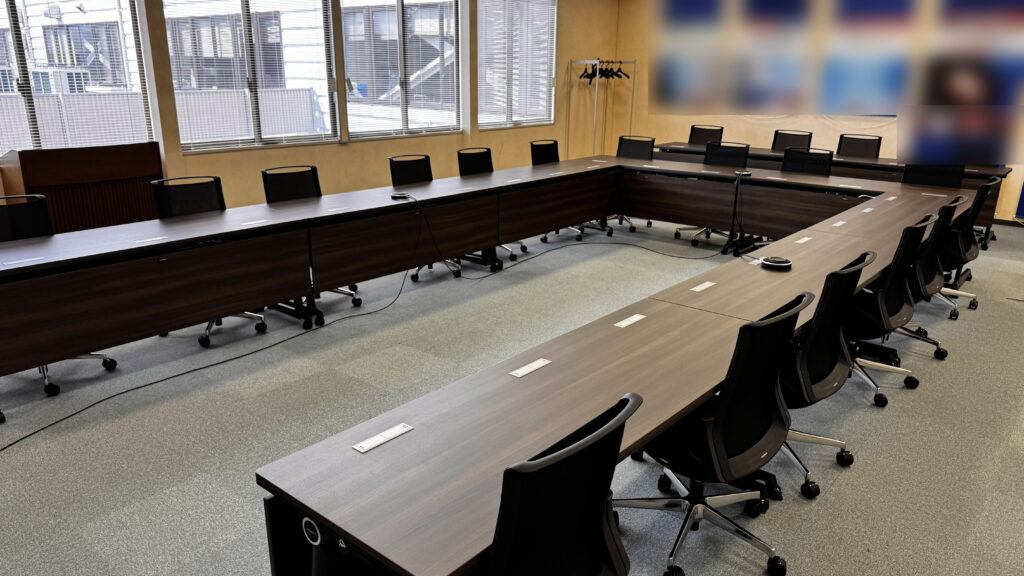 2025年6月11日 / 最終更新日 : 2026年1月9日 桧山事務器 オフィスデザイン実績 某企業様/会議室 プレゼンテーションや会議などを行う大切なお部屋の什器更新でオカムラのエレガスタ(テーブル)とモード(チェア)をご採用いただきました。 配線機能付きながら、ゆったりとした下肢空間の「エレガスタ」と、高いデザイン性ながらも座り心地の良い「モード」で、長時間の会議でも快適にお使いいただける空間になりました。